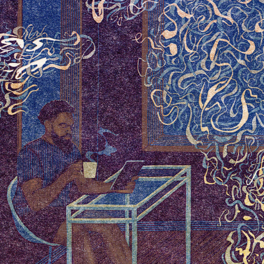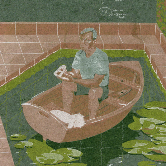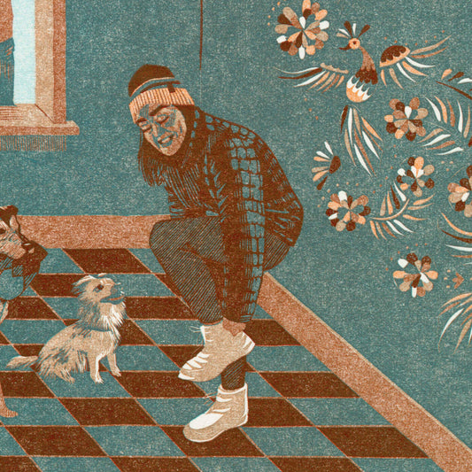 Since 2021, I have been interviewing people about comfort, and using these dialogues to inspire imaginary rooms in my artwork. Glimpses of these conversations can be read in the product description of each print. They all offer unique wisdom and hold space differently. Each room houses one or two protagonists, occasionally accompanied by their loved ones or pets. Beyond interior design, many of the rooms include an aspect of magical realism, something not-quite-possible.